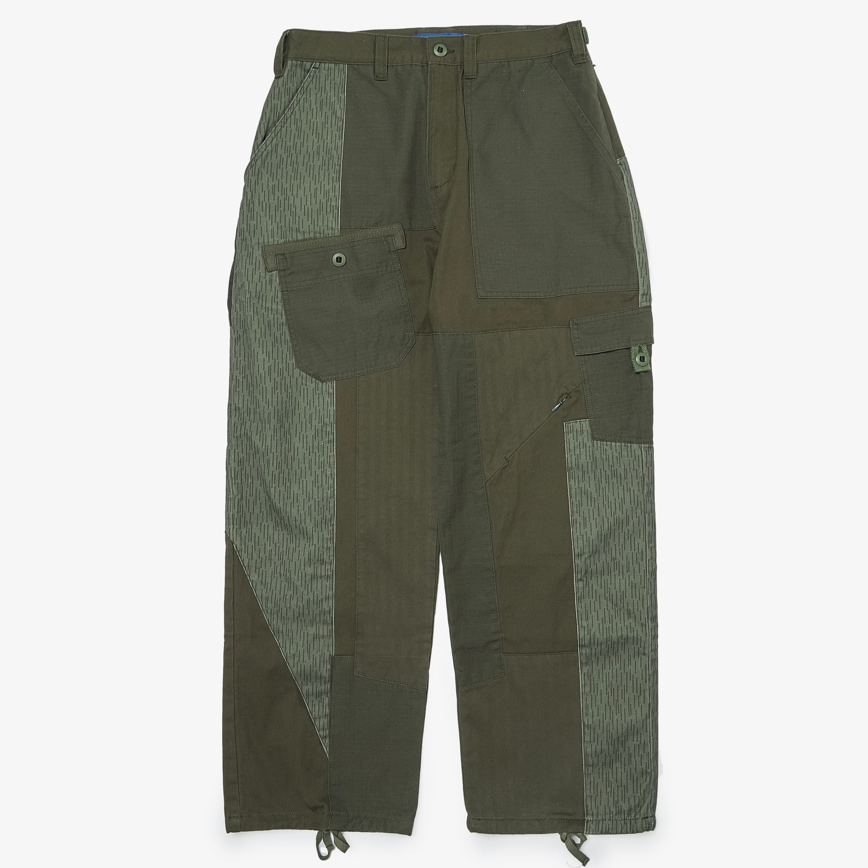 ツイル、リップストップ、ヘリンボーン、レインカモの4種類の生地をパッチワークしたオリジナルディテールのカーゴパンツです。