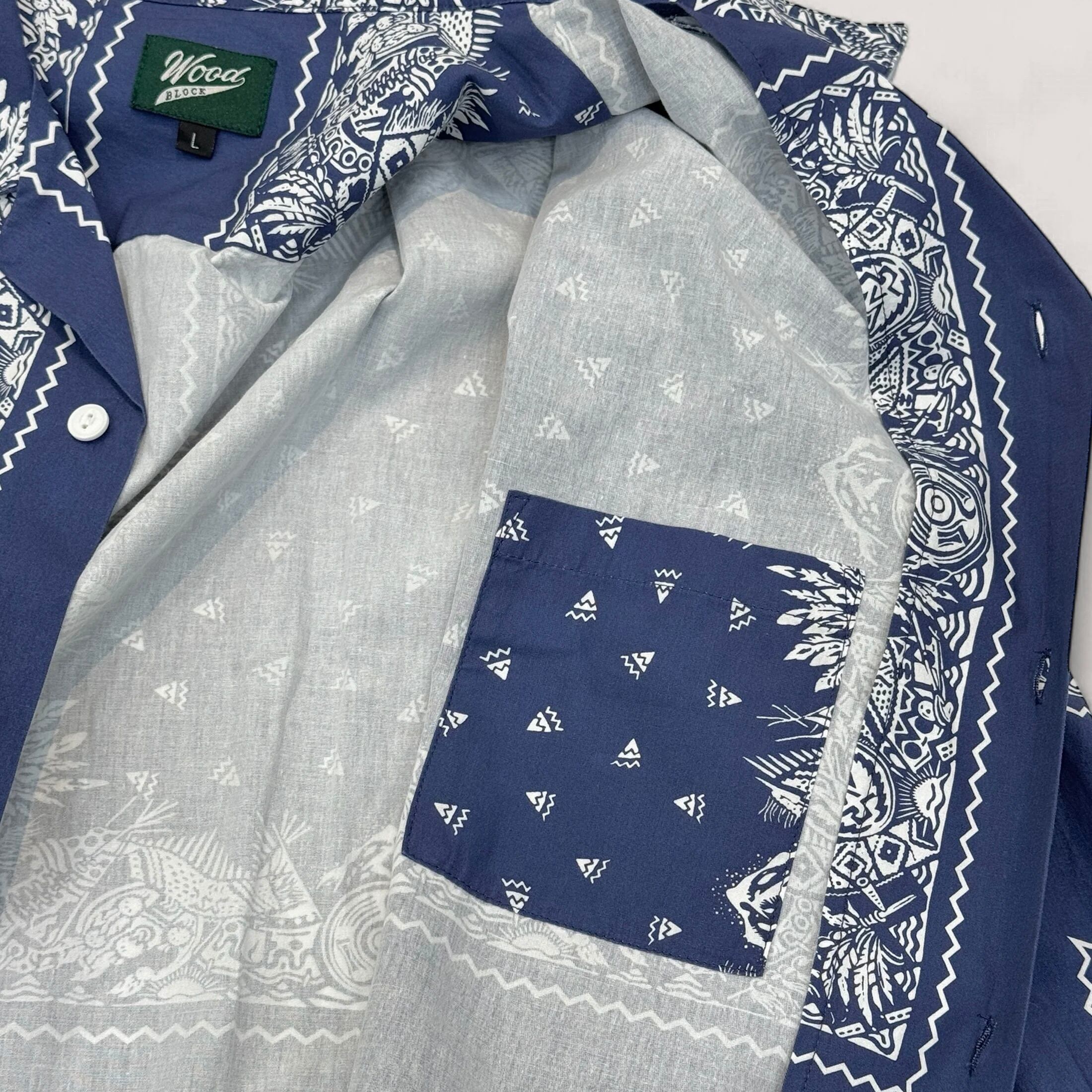 WOODBLOCKバンダナのロゴなし仕様の総柄プリントを施したオリジナルファブリックを使用したLS OPEN COLLAR SHIRT。