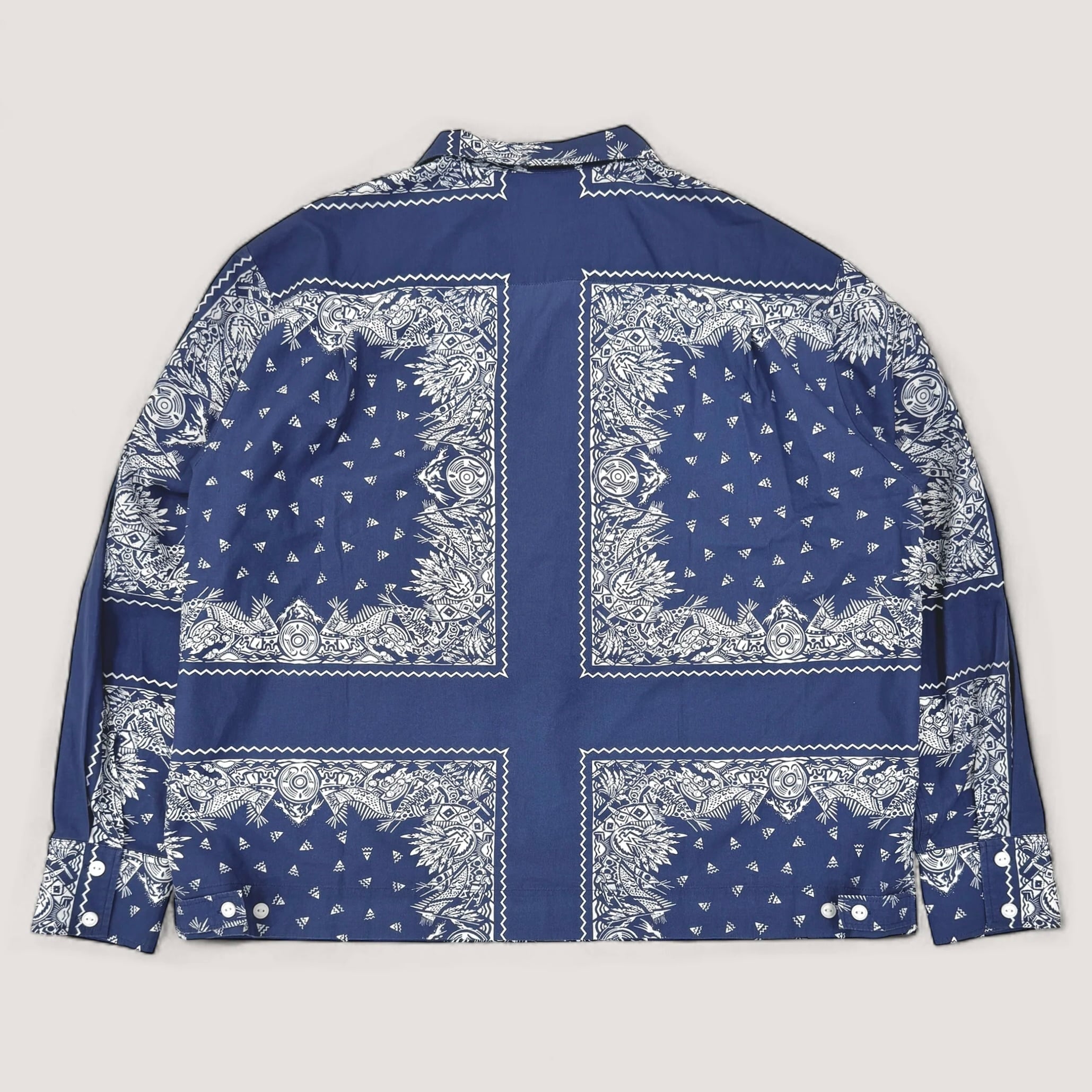夏場も着用できる長袖シャツを作りたくバンダナ同様のライトな生地(COTTON 100%)をそのままシャツに落とし込んだ1着。