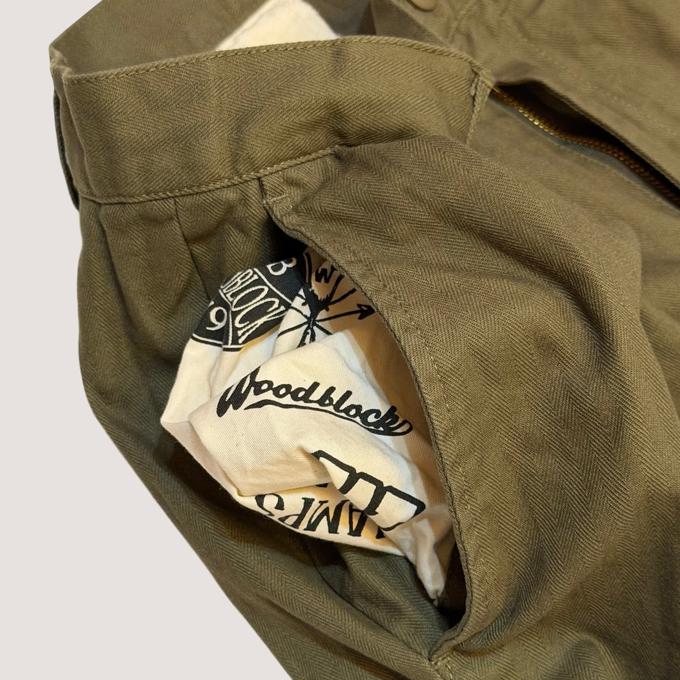 HERRINGBONE COTTONはミリタリー物などによく使用される生地で、洗いや、着込んでいくうちに味が出ていくので経年変化もお楽しみいただけます。