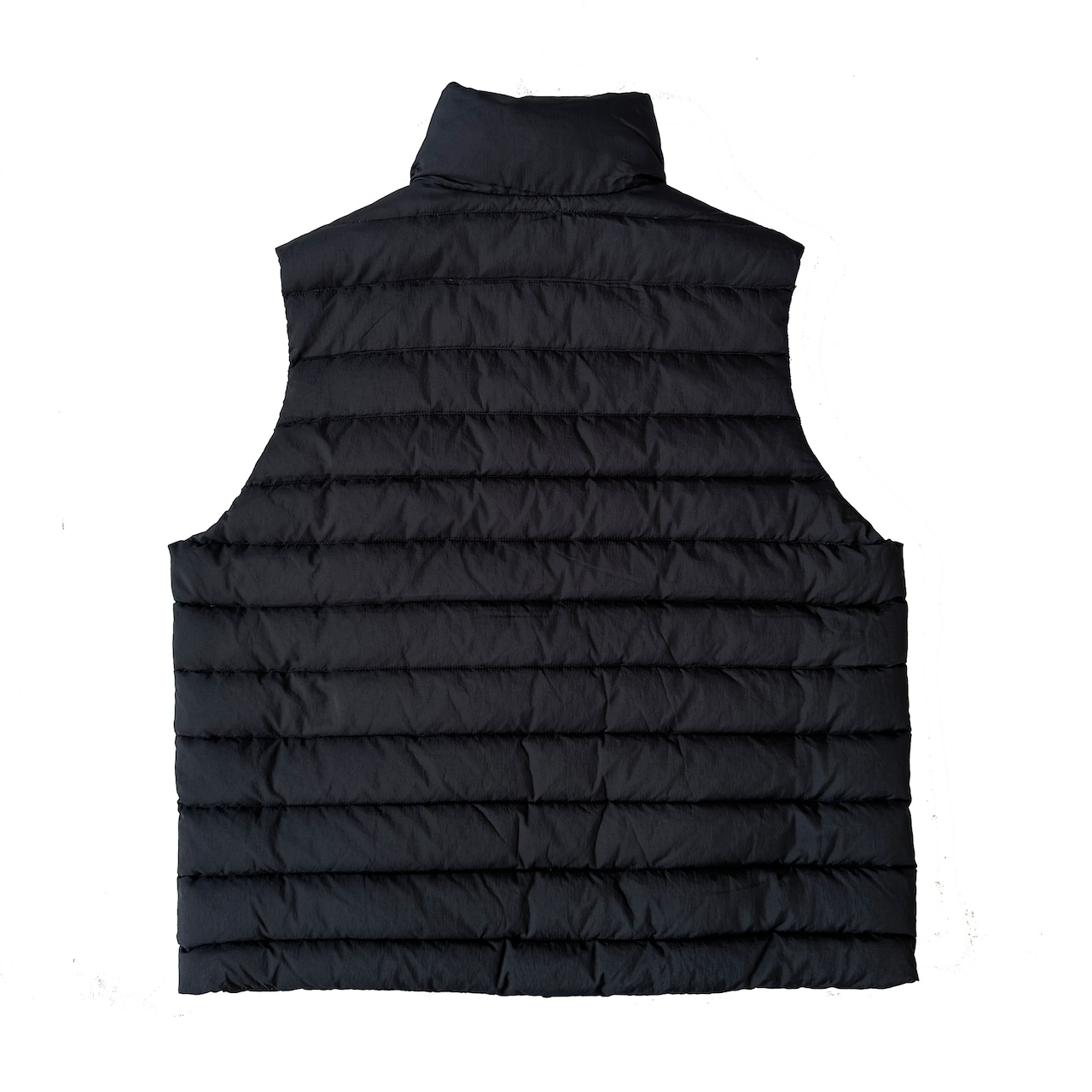 ワイドな身幅とアームホールにより、ボリュームのあるスウェットやライトアウターの上にも羽織れる汎用性の高いダウンベストです。