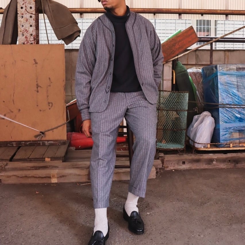 上質で肉厚なストライプのWOOL素材(WOOL50%、POLYESTEER 50%)を使用したことでスポーティーなアイテムに上品さをプラス。