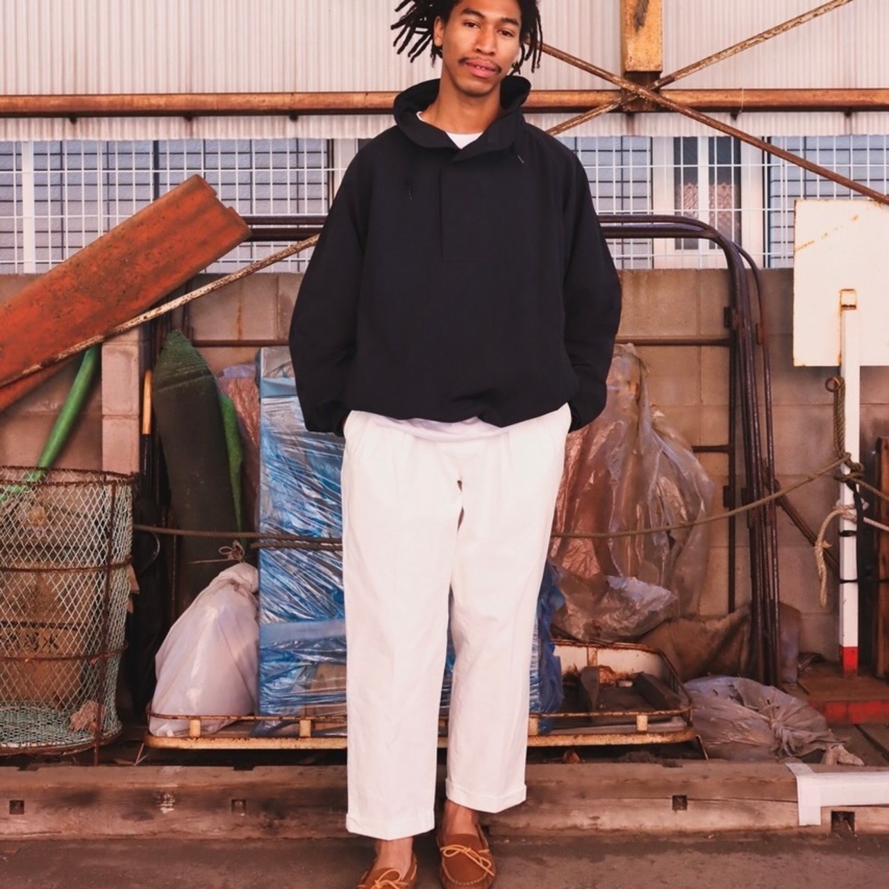 両袖はゴムシャーリング、両サイドに大ぶりなポケット、首元と裾にはコットン製の丸紐のドローコード付きなので裾をそのままでも、もちろん絞っても着用いただけます。